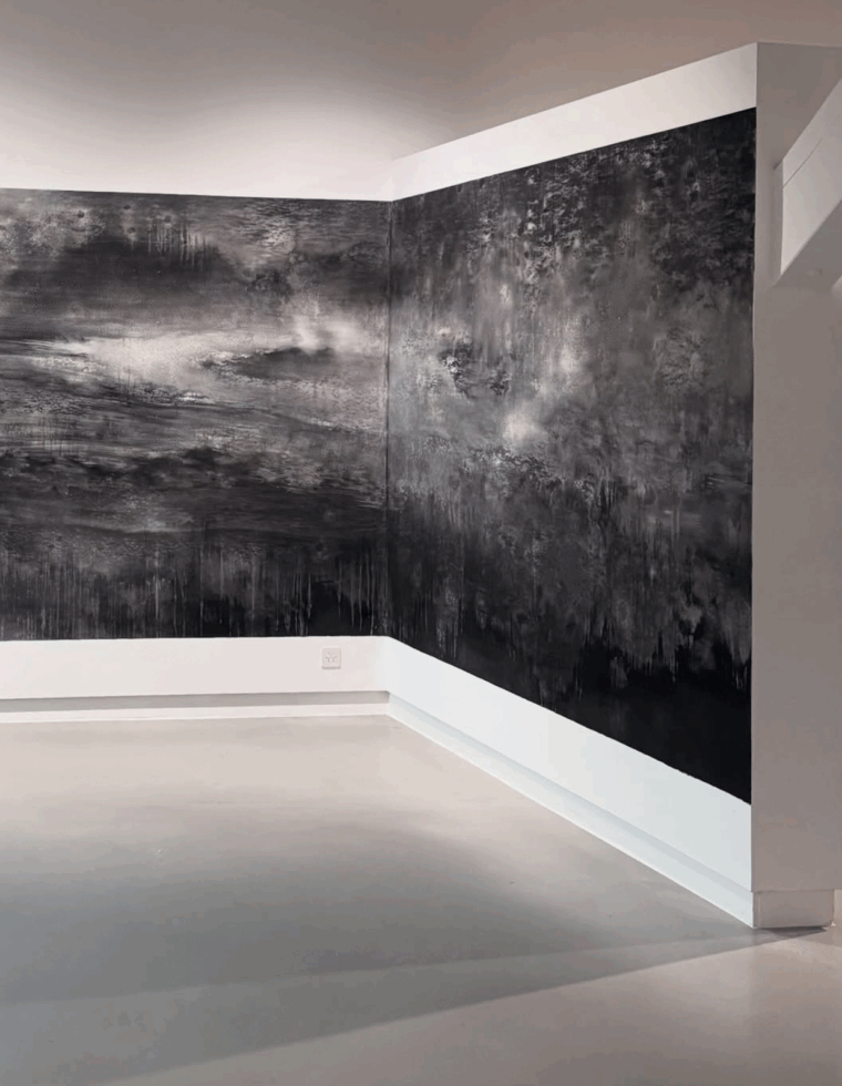 L’artiste travaille au fusain sur des plaques d’aluminium ou à même le mur. Sa force lyrique nous convie à une proposition immersive et introspective.